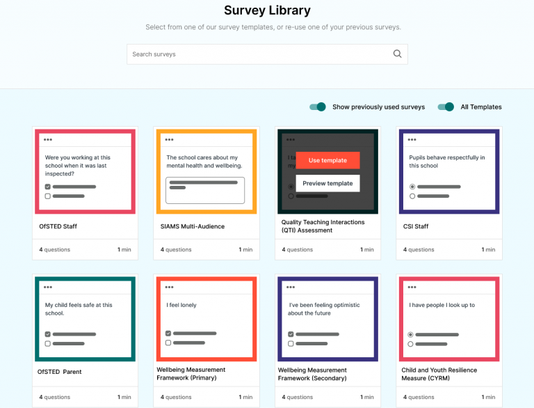 • MATs and all schools have their own dashboard and can create and run surveys, and see their results, insights and actions. There is an inbuilt clash monitor to ensure those creating surveys at a school or MAT level are aware of others that have been scheduled.