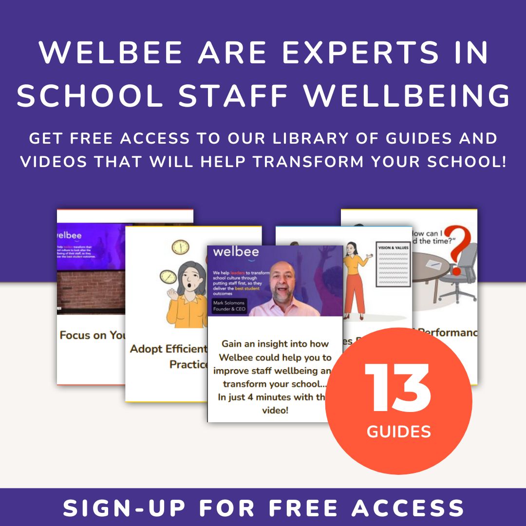01277 554001If you are the decision maker at your school or MAT and you want to improve your staff wellbeing, then you’re in the right place!You may have already heard of Welbee, however you may not be sure what’s your next step to improve staff wellbeing?Well, we’ve put together 13 unique, easy to follow guides that will enable you to learn and immediately start to implement practices that will improve your staff wellbeing.Additionally we have created over 80 minutes of videos that step you through our process for helping you systemise and improve staff wellbeing which include a quick demo, what our customers say and also answering some of your questions.The best part is that you can access all of this completely for FREE!It’s easy, just enter your name and email below and keep an eye on your inbox!