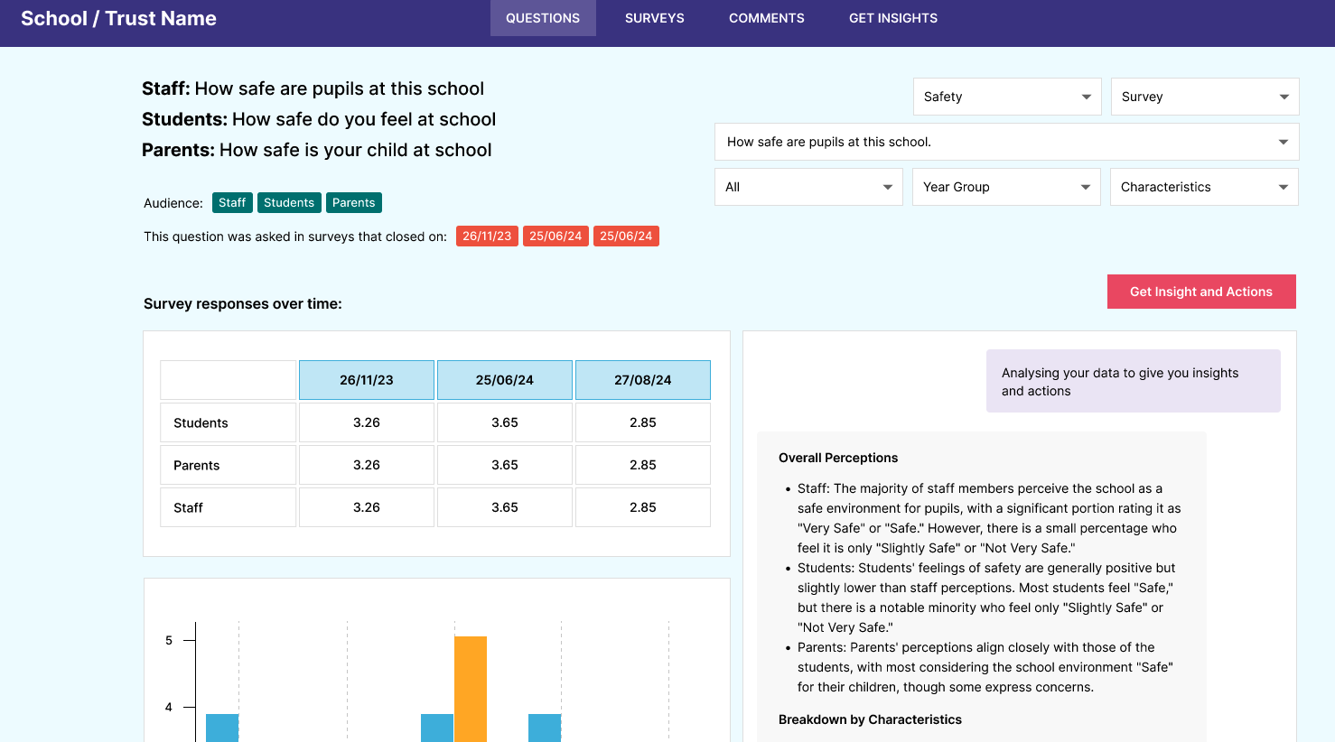 See how the views of staff, pupils and parents compare on the same topics with unified analytics — allowing you to see key differences and track changes over time.